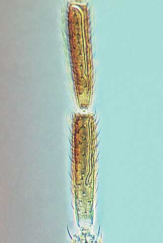 The sensoria on antennal segments III and IV are linear in most Aeolothripidae with a slight curve around the apex of the segments. The antennal sensoria of Rhipidothrips are interpreted as having almost lost the linear portion and retained only the distal curved portion, but R. gratiosus retains the linear portion of both sensoria as a series of isolated areas (Hoddle et al., 2008). Species in three genera do not have linear sensoria, these being Cycadothrips in Australia, and Dactuliothrips and Orothrips in western USA.