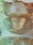 OzThripsFemale macropterous and broadly robust; body blackish-brown, antennae paler with III and V yellow; fore wing dark particularly at fork of veins, and with two blacker swellings on fore margin; microtrichia on surface of wing near base almost tuberculate. Antennae with 7 or 8 segments, VI–VIII forming a tapering unit; sensoria on III & IV forked. Head transverse, ocellar hump long. Pronotum strongly transverse. Metanotum with broad triangular area. Mesosternum reticulate, metasternum trasversely striate; metafurca long and V-shaped. Tergites II–VIII with median setae long, arising on sides of median reticulated groove, IX–X with similar groove; tergites with smooth craspedum medially, toothed craspedum laterally. Sternites boldly reticulate, with unlobed craspedum.