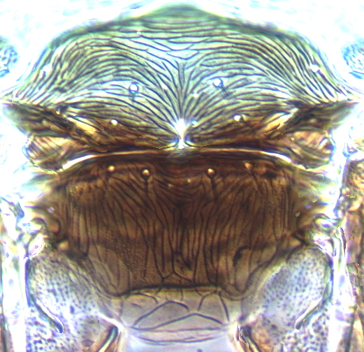 OzThripsMacropterous, strongly bicoloured; head brown with postoccipital region and anterior half of pronotum yellow; pronotal blotch and pteronota, also meso and metasternum, dark brown; abdominal segment I yellow with antecostal ridge interrupted medially, II–VI largely yellow with light brown shadings, II and III with antecostal ridge dark, VII–X dark brown; legs mainly brown, hind tibiae variably paler, all tarsi yellow; fore wing with pale sub-basal area then uniformly light brown but paler toward apex. Head with occipital carina close to eyes; ocellar triangle transversely striate with markings in between the striae; ocellar setae III on or within anterior margins of triangle; three pairs of postocular setae, median pair long; postoccipital region transversely striate/reticulate; mouth cone extending between fore coxae. Pronotum anterior third transversely reticulate without internal markings; blotch transversely striate with many markings between the major lines; blotch almost rectangular, anterior and posterior margins concave but posteromedian paired setae arising on dark area. Mesonotum and metanotum with many small linear markings between the major sculpture lines, metanotal reticulation irregular but mainly linear. Metasternal anterior margin with shallow emargination. Fore wing with or without one or two setae displaced distally onto second vein from first vein; wing apex with long sub-apical lobe. Tergites I–VI medially without marginal microtrichia, IV–VI with many discal microtrichia medially. Sternites II–VII medially without marginal microtrichia, but a few discal microtrichia sometimes extend mesad of setae S1 near posterior margin.
