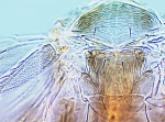 OzThripsFemale macroptera. Body, legs and antennae pale brown, hind tibiae paler, antennal segment I white; fore wing weakly shaded in basal half; tergite IX major setae brown. Head wider than long; transverse sculpture lines behind eyes, ocellar triangle without sculpture; eyes with 6 pigmented facets; ocellar setae III outside triangle. Antennae 9-segmented, III–IV with forked sensorium; II with a few short microtrichia near apex; VI not pedicellate, suture oblique between VI–VII. Pronotum with faint transverse lines, posteromarginal setae S1 slightly larger than remaining setae; prosternal ferna weakly divided. Metascutum irregularly reticulate, reticles sometimes elongate; median setae not close to anterior margin, campaniform sensilla absent. Fore wing first vein with about 9 setae near base, 2 setae medially, 2 setae distally; second vein with about 12 setae; clavus with 6–7 veinal setae plus one seta at base. Abdominal tergites II–VII with no sculpture medially; laterally with about 8 transverse lines with few or no microtrichia, not extending mesad of setae S2; VIII with long regular posteromarginal comb.