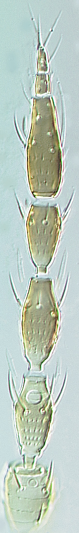 OzThripsFemale macroptera. Body and legs yellow, antennal segments II–VIII increasingly brown; fore wings pale. Antennae 8-segmented, III–IV with apical neck bearing forked sensorium. Head slightly wider than long; 3 pairs of ocellar setae, pair III between posterior ocelli and about as long as one ocellus; 4 pairs of small postocular setae in transverse row; maxillary palps 3-segmented. Pronotum transverse, with one pair of posteroangular setae; discal area with almost no sculpture. Metanotum with weak transverse reticulation, median setae behind anterior margin; campaniform sensilla present. Prosternal ferna weakly complete medially; mesofurca with spinula, metafurca with no spinula. Fore wing first vein with 2 widely spaced setae distally, second vein with about 12 setae; clavus with 5–6 veinal and one discal seta; posterior fringe cilia strongly wavy. Abdominal tergites II–VI with narrow posteromarginal craspedum; tergal discal area with little or no sculpture medially; VIII with complete comb of long slender microtrichia, weakly developed ctenidium anterolateral to spiracles. Sternites without discal setae, posterior margins with weakly lobed craspedum; VII median pair of setae arise submarginally.